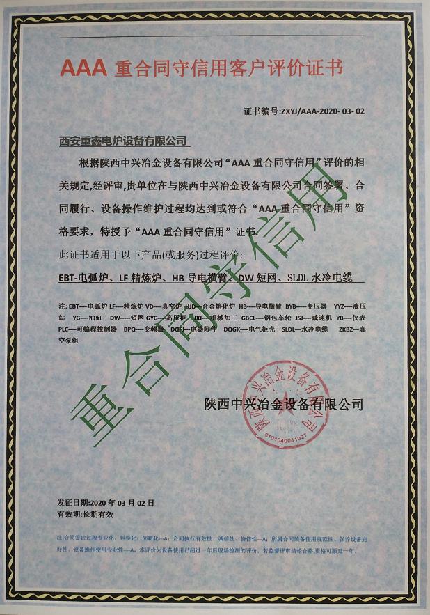熱烈祝賀西安重鑫電爐榮獲陜西中興冶金設(shè)備有限公司