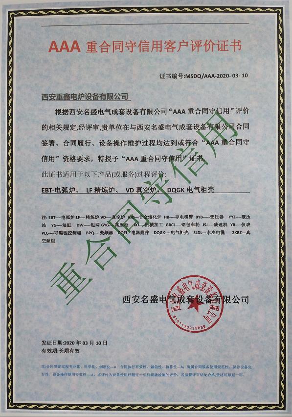 熱烈祝賀西安重鑫電爐榮獲西安名盛電氣成套設(shè)備有限公司"AAA重合同守信用客戶評價(jià)證書"!